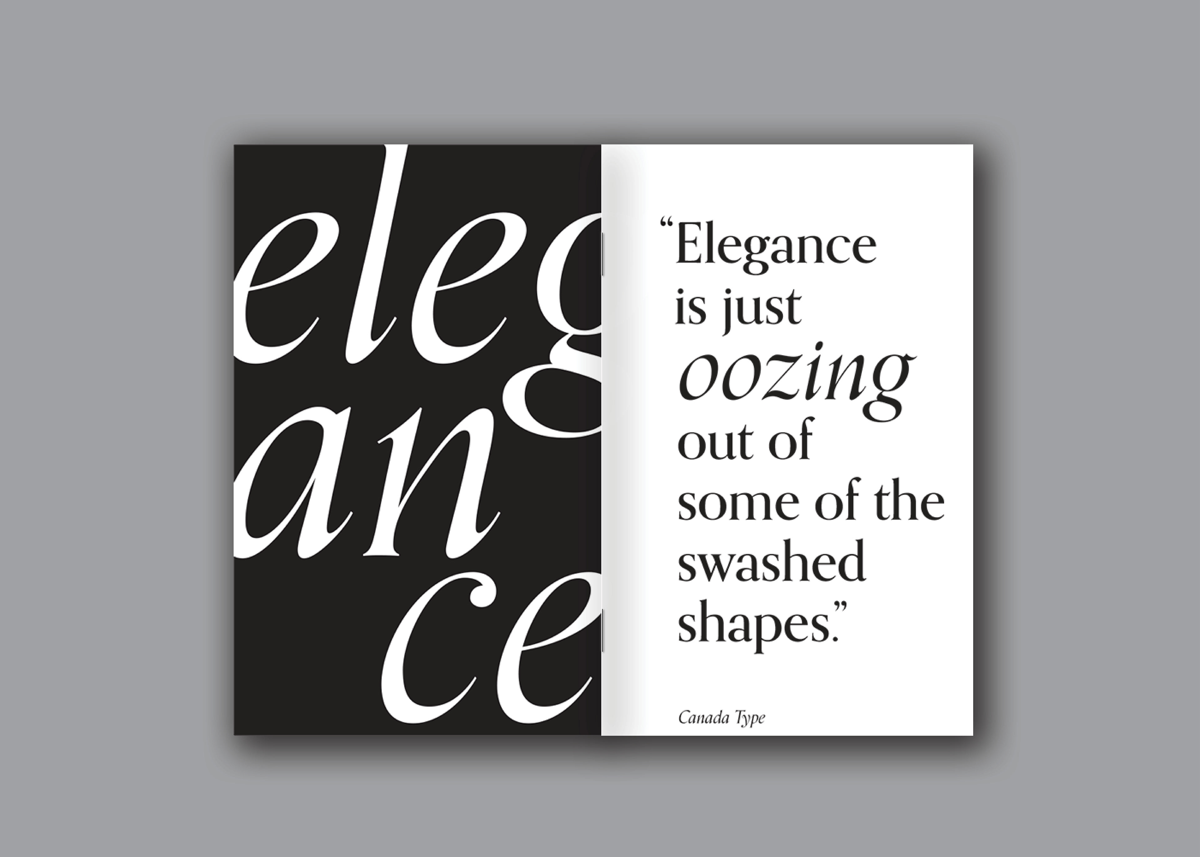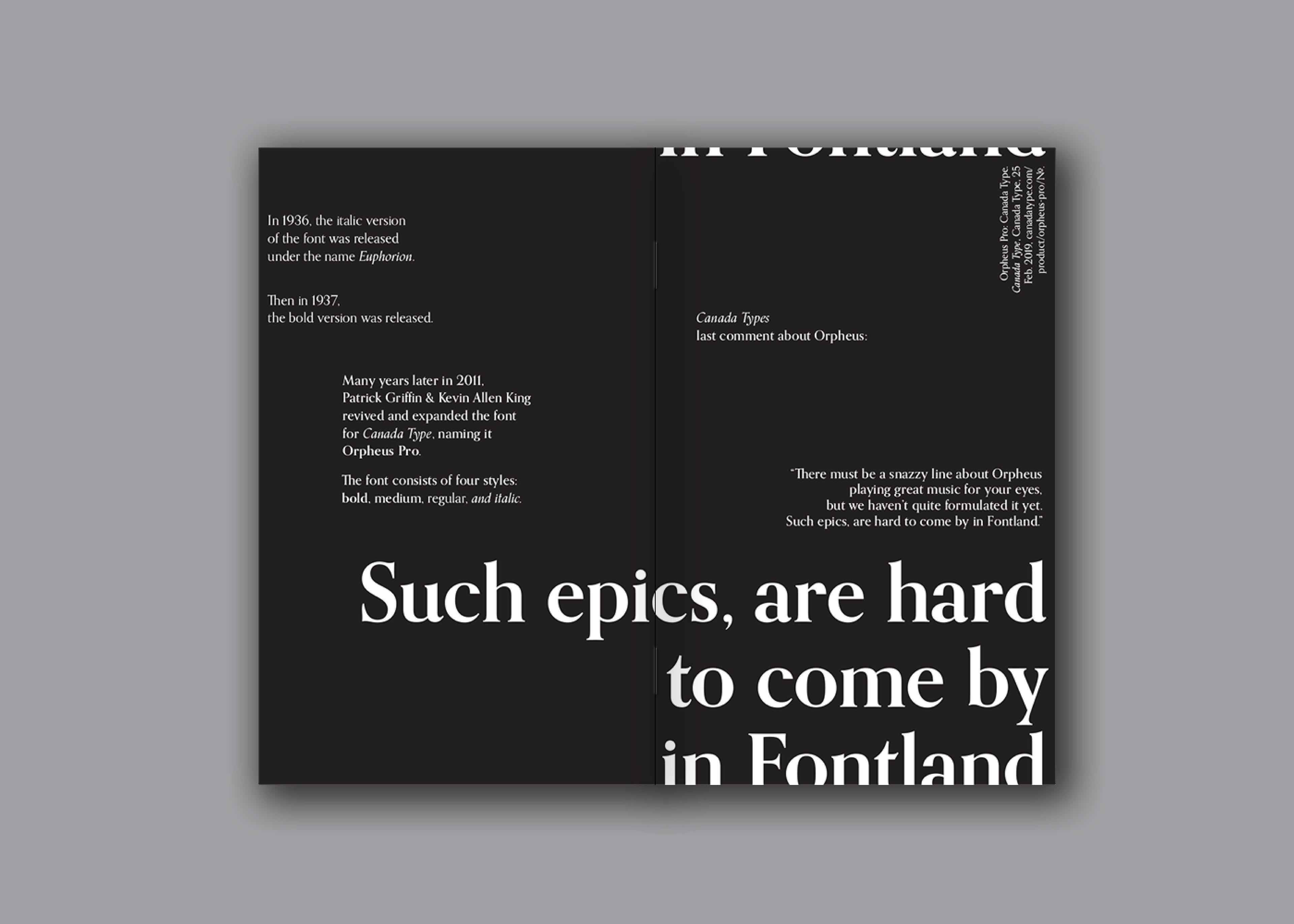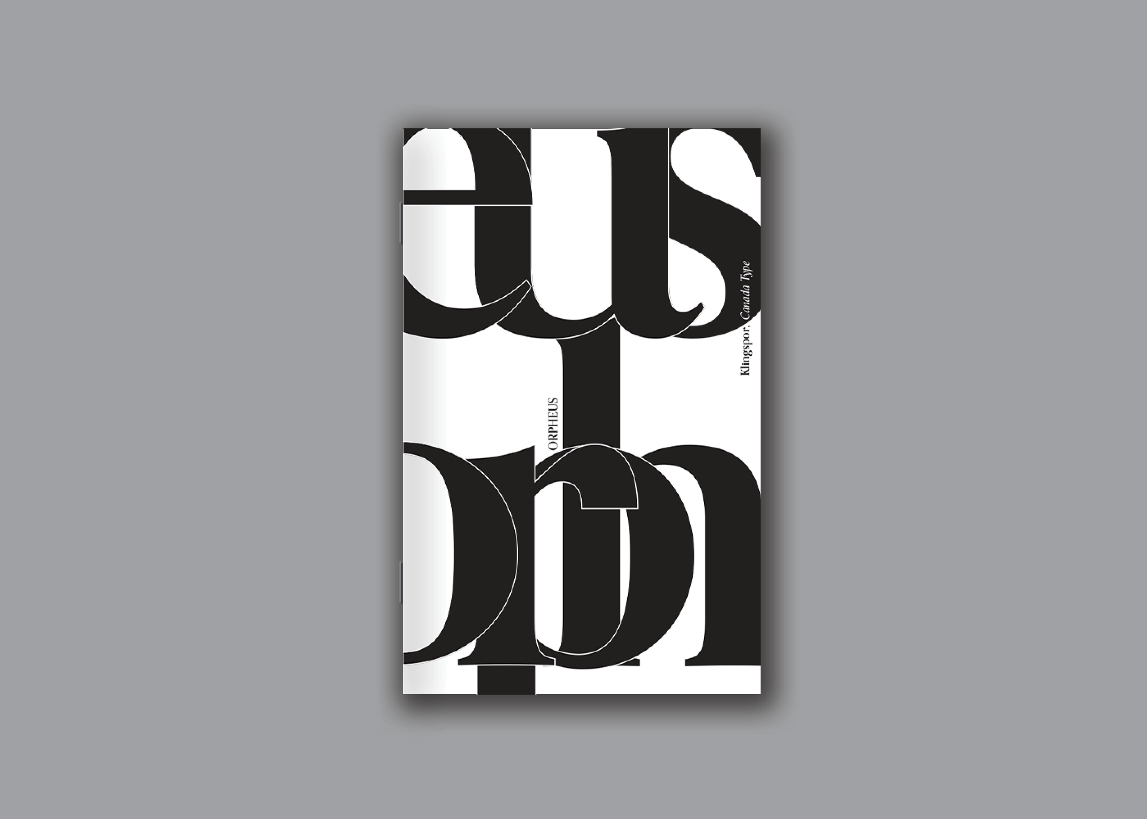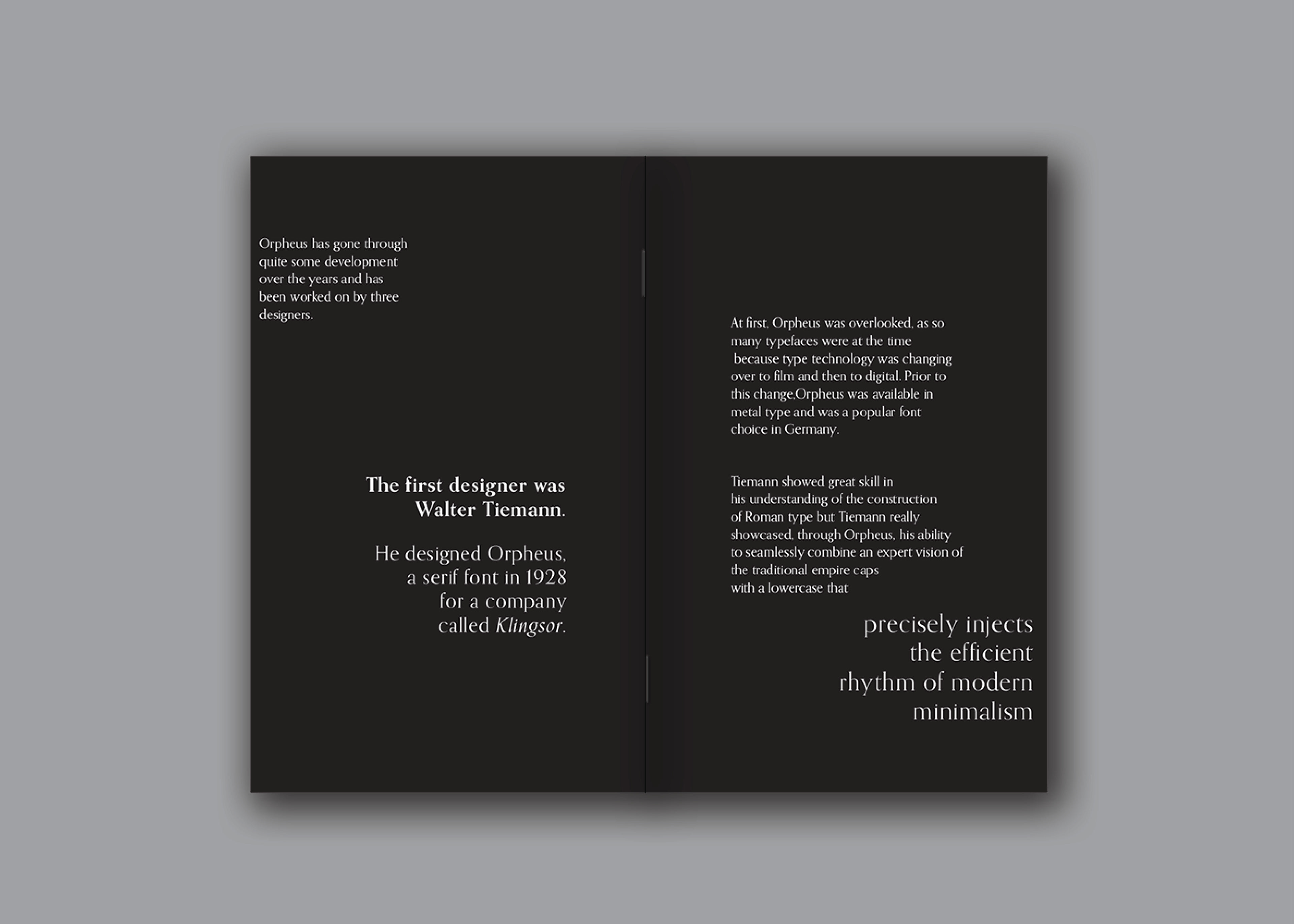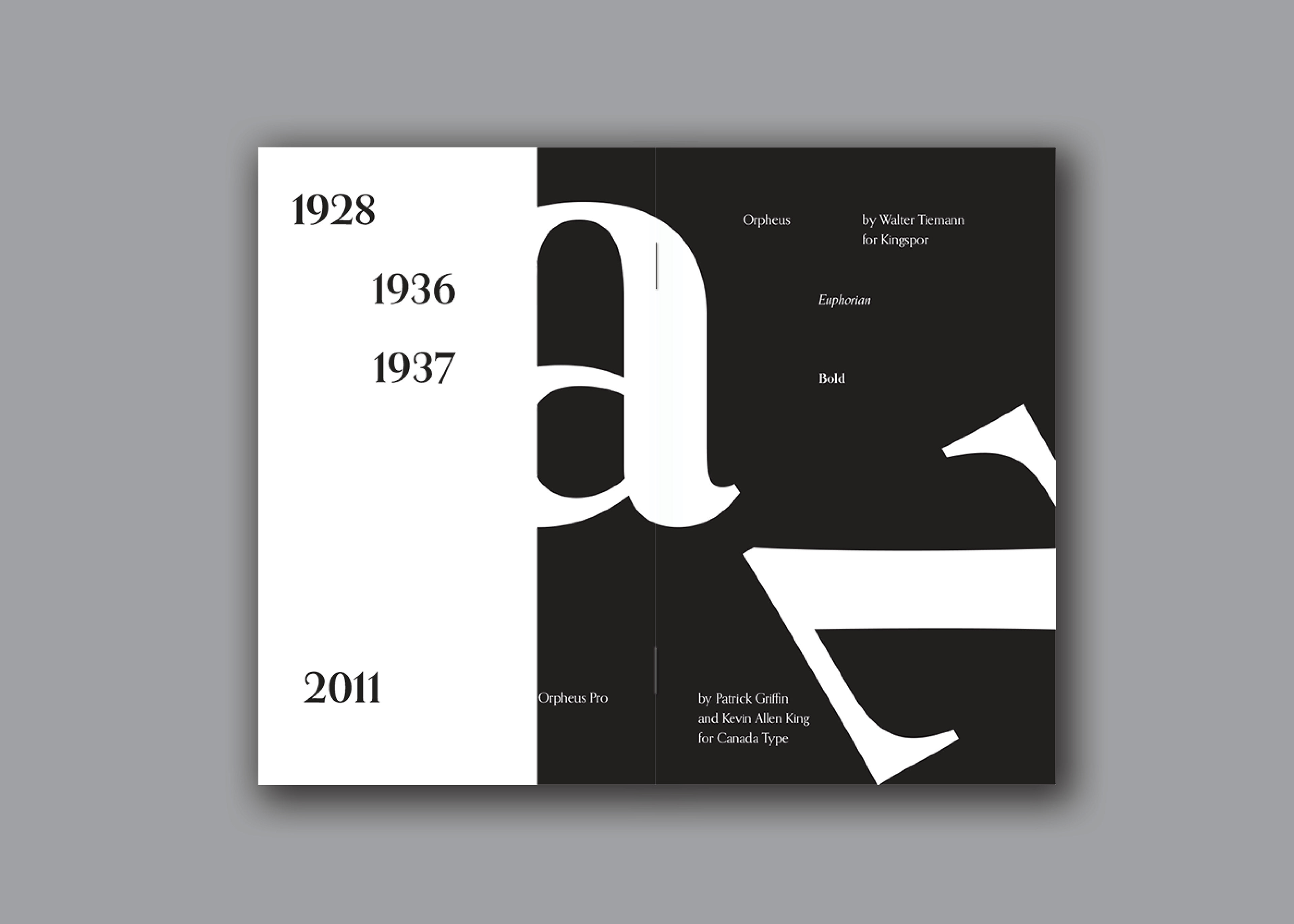 Orpheus informs the viewer of the font’s history while showcasing the anatomy of the font itself. The book design uses positive and negative space to expose Orpheus’ sharp edges and fluid curves, resulting in an elegantly balanced design.