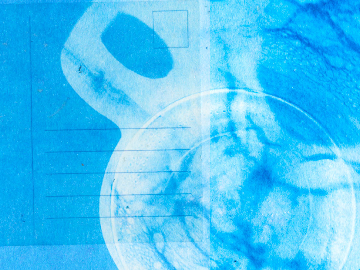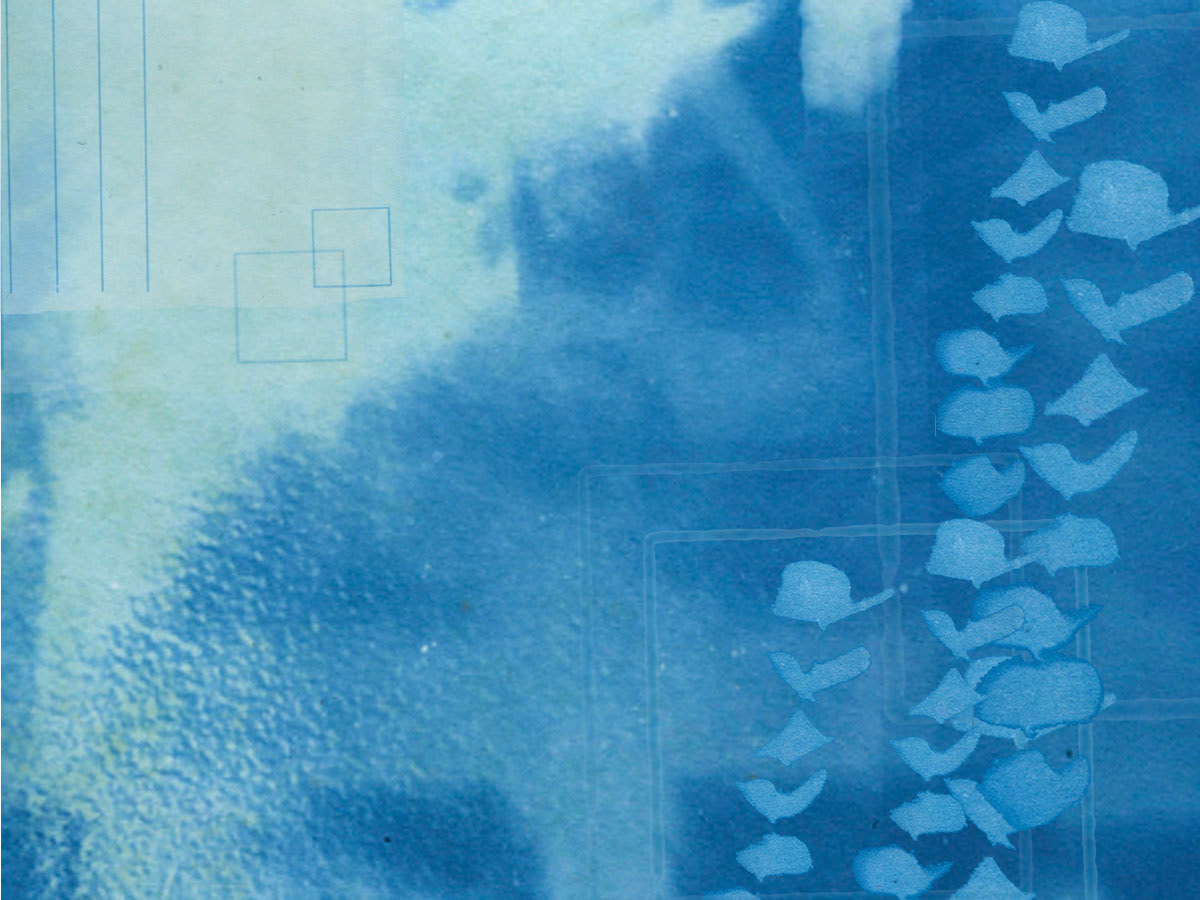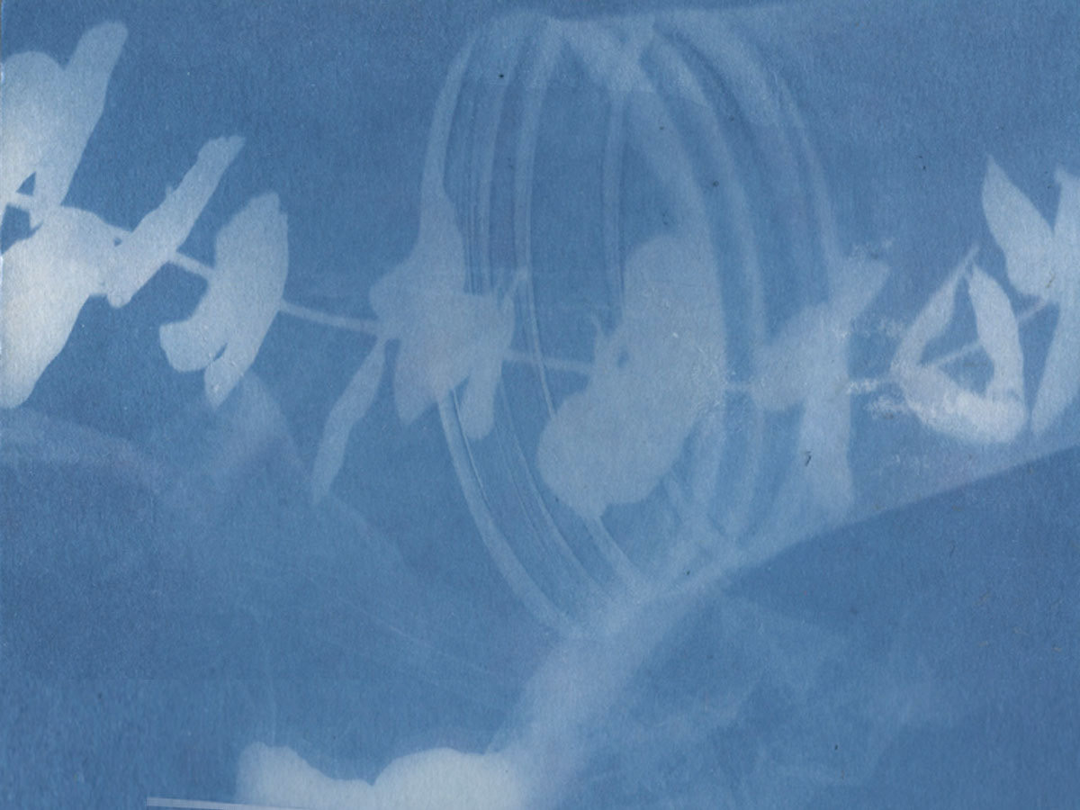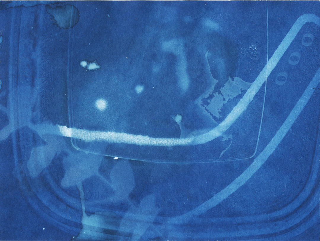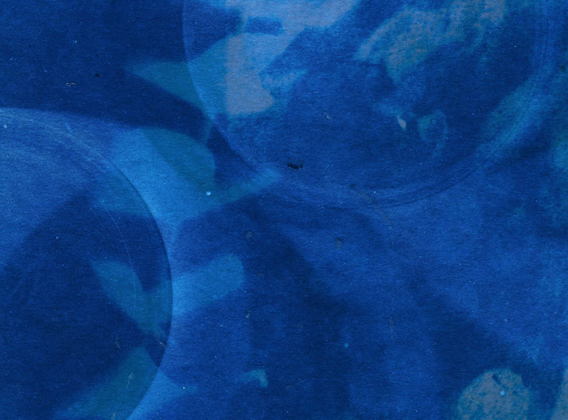 Reclaimed Blues are scanned and digitally manipulated cyanotypes created with recycled plastic and objects found in nature.